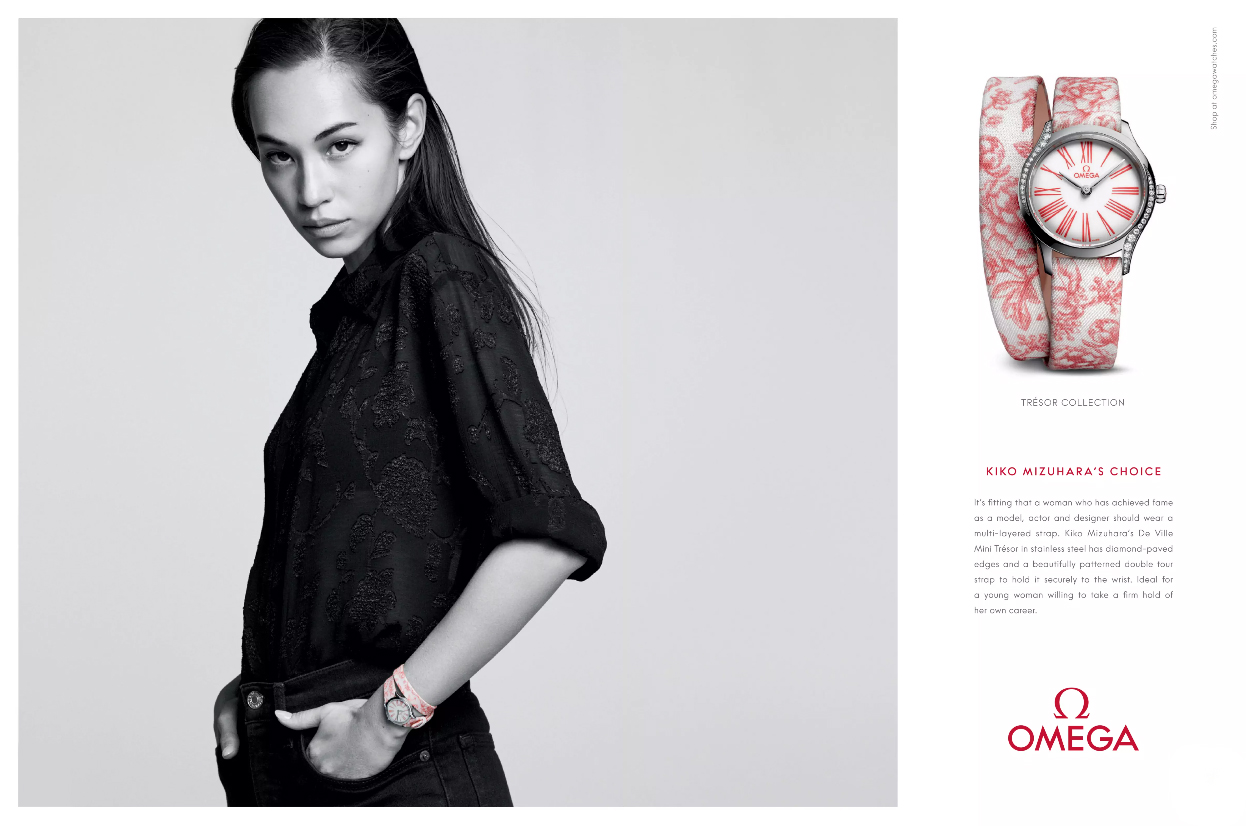 An eye-catching double page spread for Omega in Elle. Great black and white image with a pop of colour on Kiko Mizuhara’s wrist.